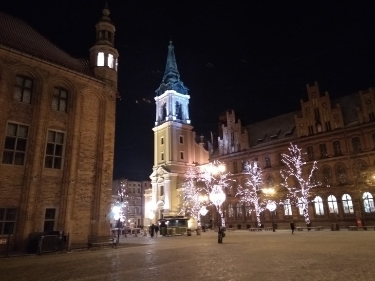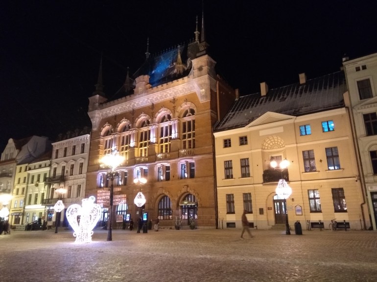 It gets dark early this time of year–around 3:45-4pm. After an early supper at a restaurant located partially in the medieval old city wall, we walked through town a bit, heading back to the flat. Annora and I took Jack-Jack on a walk. Lit up at night, Toruń is beautiful!