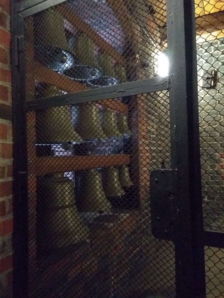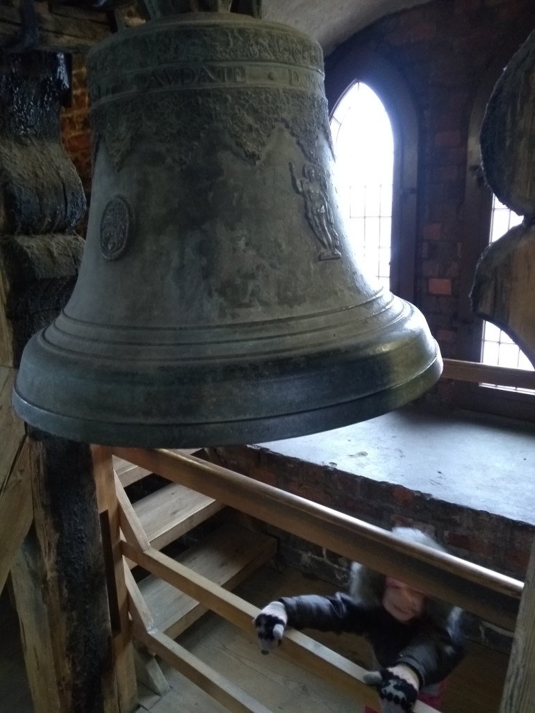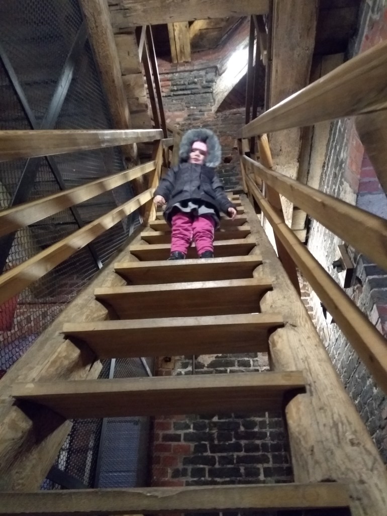 So many stairs!!! “Haven! Stop and check out these bells. Aren’t they cool?” Pant, pant. “Do you think they would be quiet?” Pant, pant. “…Or would they be loud?” Pant, pant. (The baby seems to be squishing my lungs nowadays–yeah. That’s it.)