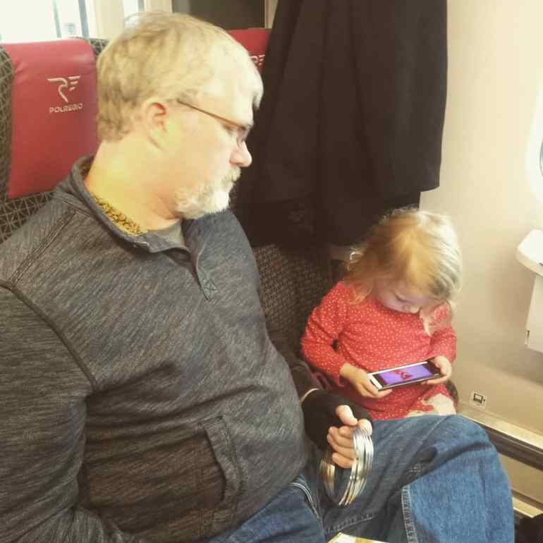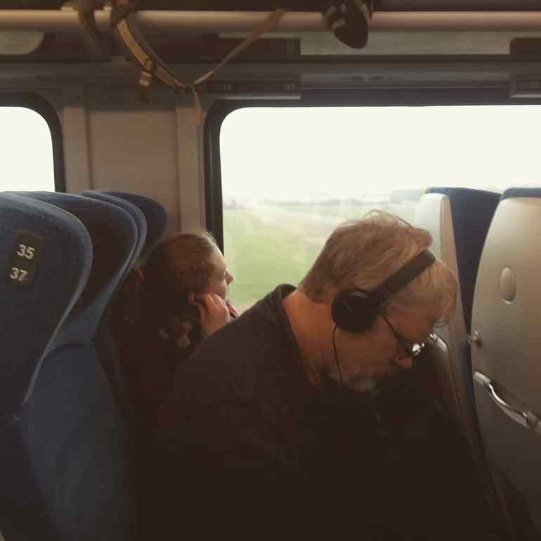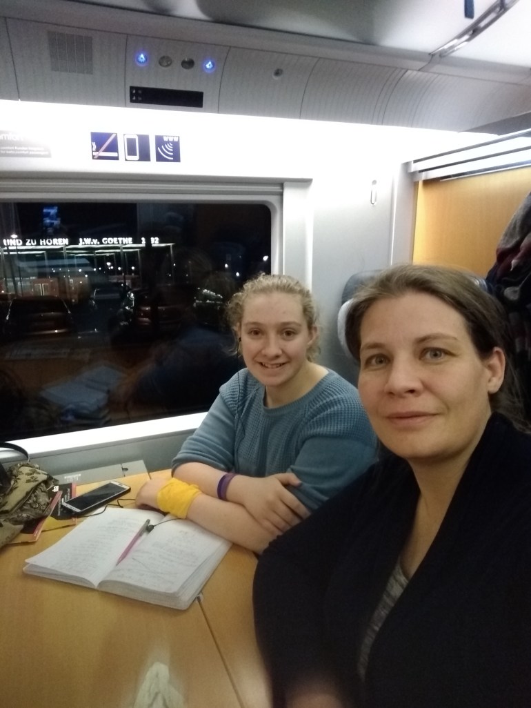 We had a short time to make our way through the multiple (4?) levels of Berlin HBF (mostly east-west lines) to the basement (north-south lines) where our connecting train was. It took us a while to figure it out. And when we found the platform, it looked like the train was the wrong one! After a minute’s speed walking, I realized that there was a second train parked super close behind the first! The first train left. The second train’s automatic doors started closing and we ran! I managed to get my hand in and jam the door so that it reopened. We hopped on, and found our seats as the train pulled away from the station. Whew! Aside from a stern, German “tut-tut” look from one of the ladies we passed, we were unscathed.