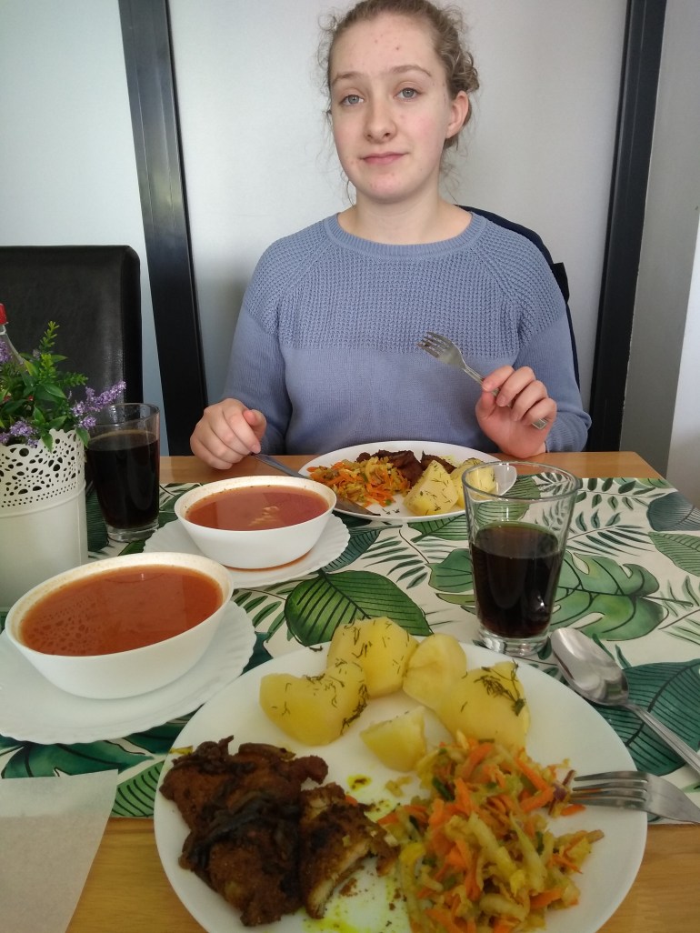 In Kutno, Poland we stopped and had some lunch at the depot restaurant. Tomato soup, curry chicken, potatoes (with dill of course), and fresh cabbage salad (a type of “slaw” for those of you who say “y’all” 😉), and Cokes. Total cost was about $12 for both of us together.